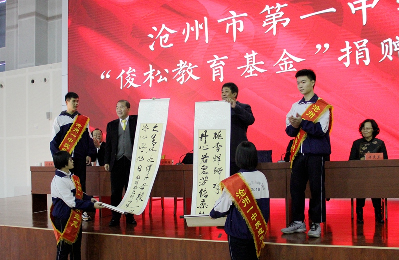 沧州市委常委、宣传部部长贾发林把写有“大善如水,泽及母校,一片冰心明旭日;丹心若泉,芳传桑梓,连枝桃李辉狮城”的对联赠送给刘明辉。我校校长于秀娥向刘明辉先生颁发了《沧州市第一中学“生涯导师”聘书》。