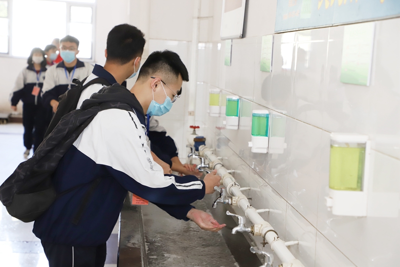 阳光下,微风中。校门口“一路有你,欢迎回家,科学防疫,人人有责”的巨幅展牌格外醒目。高三学生们在父母的陪伴下,身着校服、兴奋地来到久违的学校大门前,分批次、定时定点返回美丽的校园。为了今天的顺利复学,学校开展了两次实战演练,并拍摄了复学防疫教学视频。高三师生对复学流程已经熟记于心。