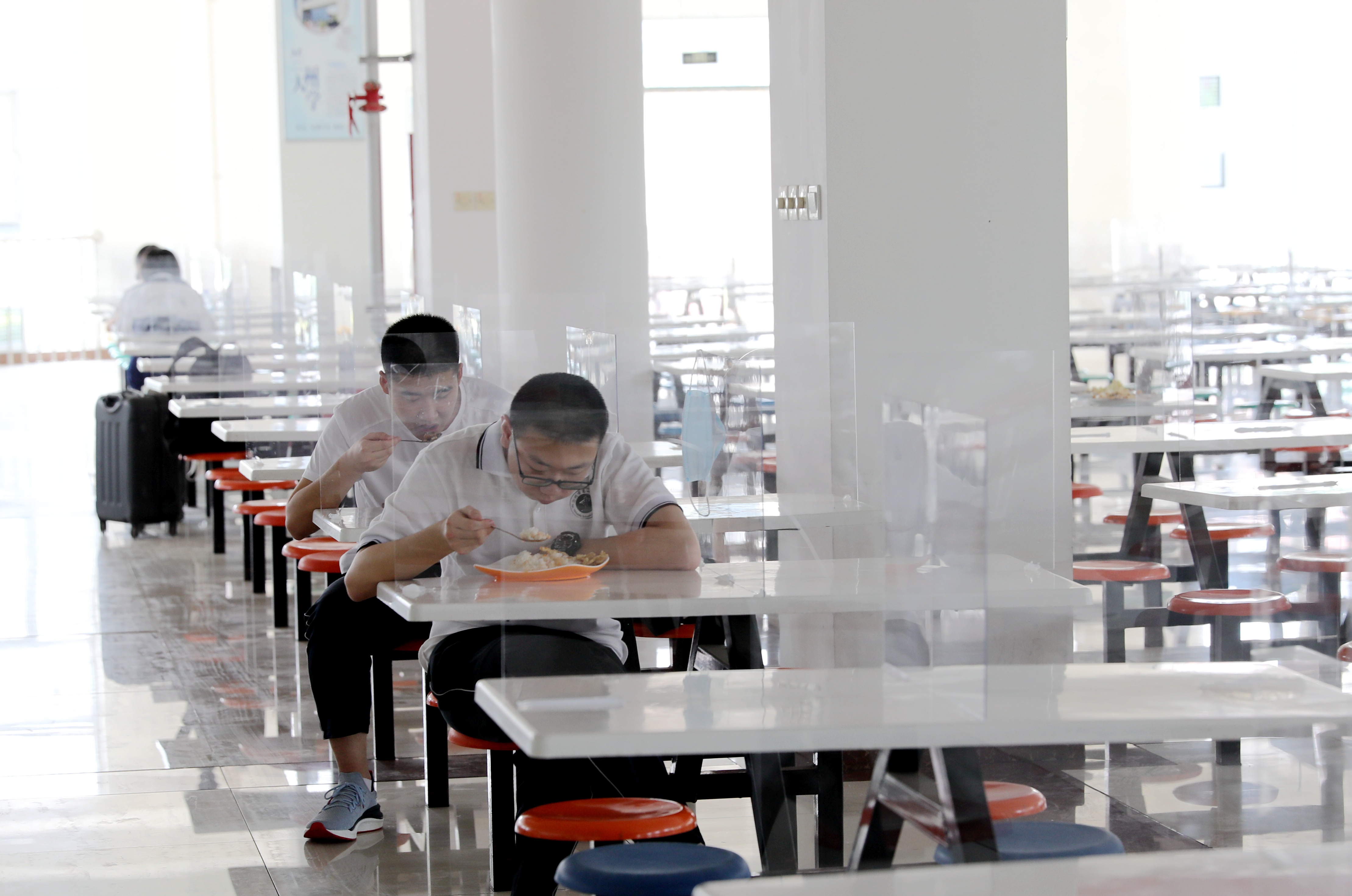 午餐时间,同学们分批错时进出餐厅用餐。学校为了使同学们在就餐时保持安全距离,特地在每张饭桌上安置了隔离挡板。