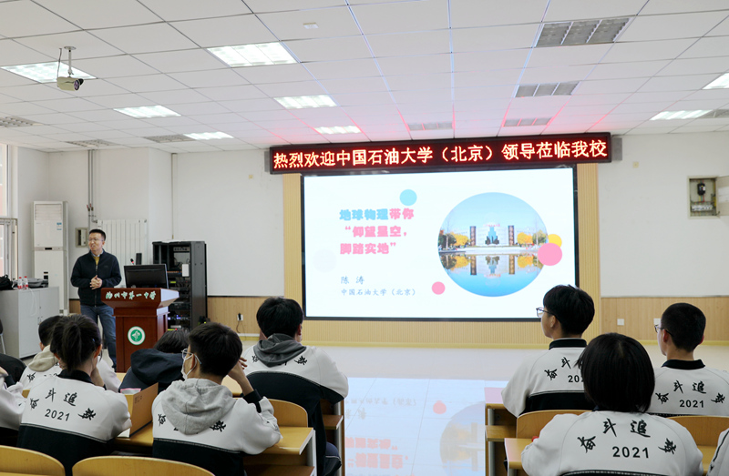 仪式结束后,陈涛博士在高二年级阶梯教室为我校学生作了题为《地球物理带你“仰望星空,脚踏实地”》学术知识讲座。陈博士从色彩斑斓、形态各异的石油切入,讲述了石油行业的发展以及在生活中的重要应用,并详细介绍了学校的专业设置、培养模式、社团活动、就业前景等。助管郭炳宜从学生感兴趣的大学生活出发,介绍了学校周边设施、住宿情况及保研考研情况,并向一中学子发出热情邀约,鼓励一中学子奋力冲刺、圆梦高考。