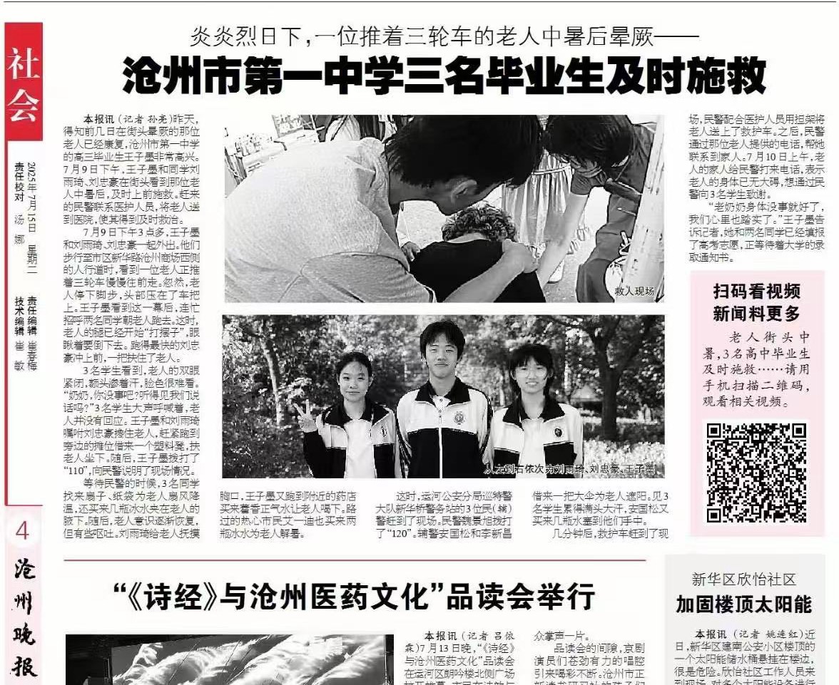 日前,沧州各媒体争相报道我校三名高三毕业生街头勇救中暑老人的事迹,引发全城点赞!