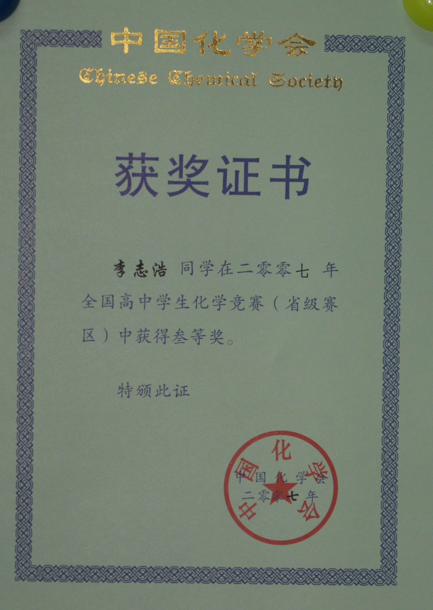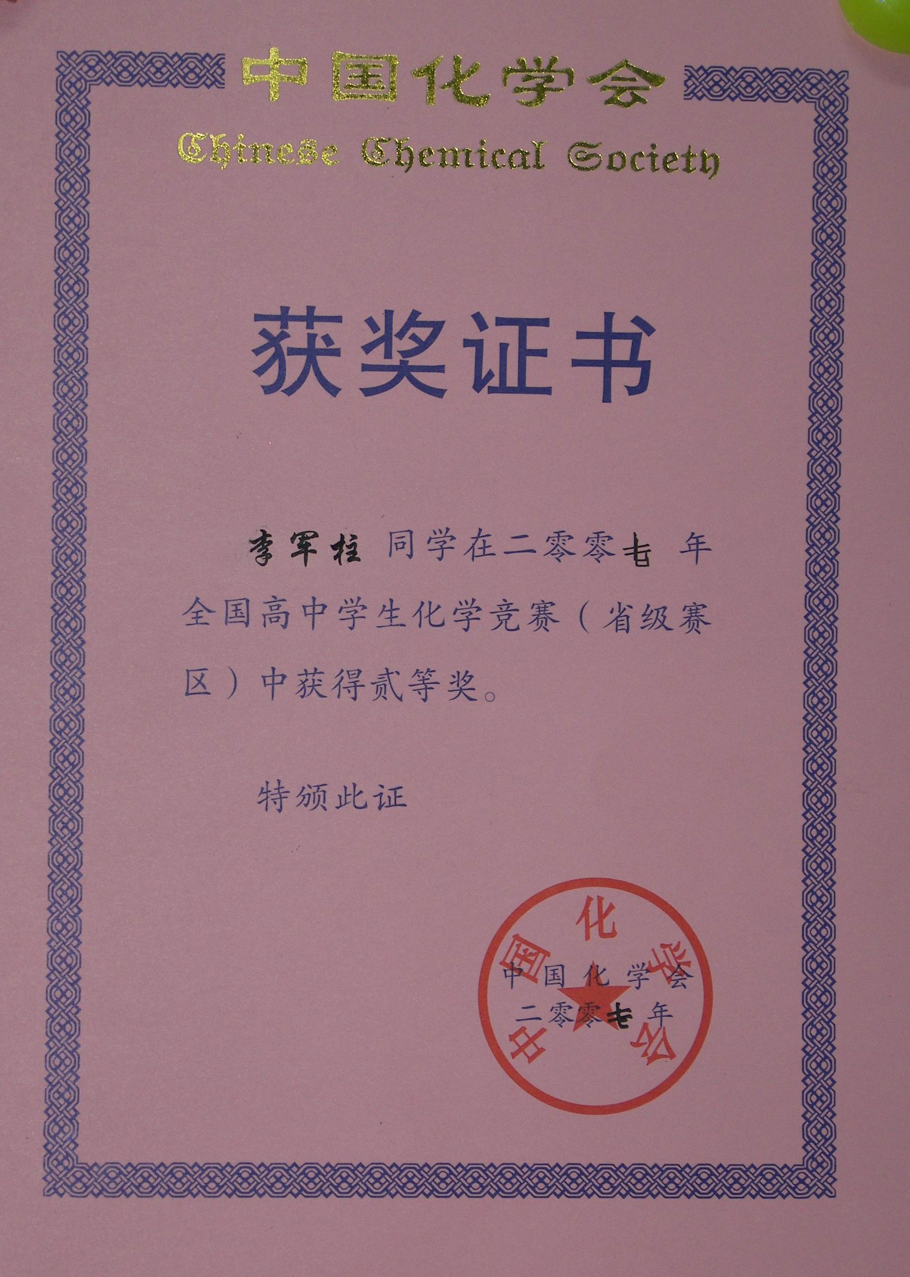 在刚刚结束的第21届全国高中学生化学竞赛中,我校高三12班学生李军柱获得国家级二等奖;高三18、19班李志浩、杨威同学获得国家级三等奖。