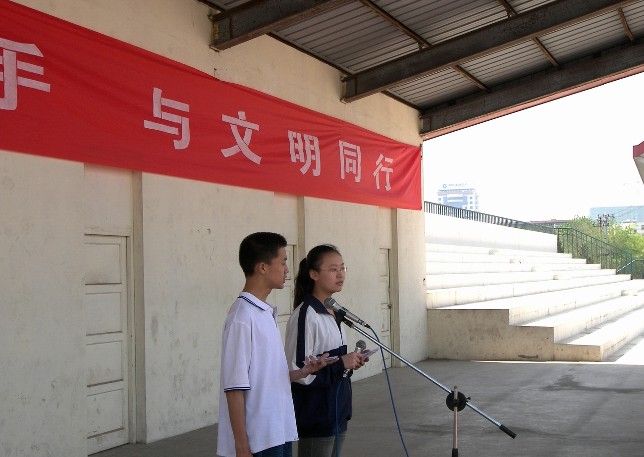 上午大课间,学校在运动场召开了“与奥运携手、与文明同行”千人签名倡议活动。活动在庄严的国歌声中拉开序幕。首先高一年级的团员代表向全校学生发出倡议,倡议大家积极参加“与奥运携手、与文明同行”活动,宣传“绿色奥运、科技奥运、人文奥运”理念,弘扬“更快、更高、更强”的奥林匹克精神,做“迎奥运、 讲文明、树新风”的实践者,用实际行动支持北京奥运会。