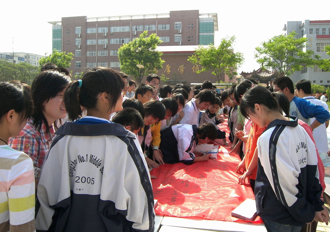 下午,全校四千多名学生自豪、庄重地在印有“与奥运携手、与文明同行” 的2008公分的横幅上签下了自己的名字,表达了对北京奥运会的祝福,并决心为迎接奥运贡献自己的一份力量。 (本站记者)