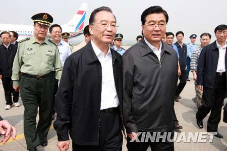 5月16日,中共中央总书记、国家主席、中央军委主席胡锦涛乘飞机抵达四川绵阳,慰问灾区干部群众,看望抗震救灾一线的部队官兵和医护人员。国务院总理温家宝到机场迎接胡锦涛。 新华社记者鞠鹏摄 |
