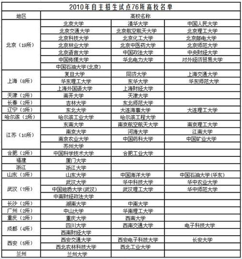 2010年进行自主选拔录取改革试点的76所高校名单: