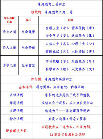 所以,下图中的家庭教育三道就是给家长朋友一个明确的依据,给家长提供了四个法则,每个法则都包含许多更细的内容,譬如列举一些: