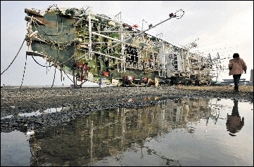 13日,在日本青森县的八户,一名路人走过被海啸毁坏的渔船。 新华社/路透
