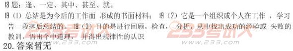 答① ② ③ ④ ⑤ 19.把下面这个长句改写成几个较短的句子,可以改变语序、增删词语,但不得改变愿意。(4分)总结是一个组织或个人在工作、学习告一段落后,进行回顾、检查、分析和评价,从中找出成功的经验或失败的教训,悟出个中的道理,得出规律性的认识,并用以指导今后的工作面形成的书面材料。