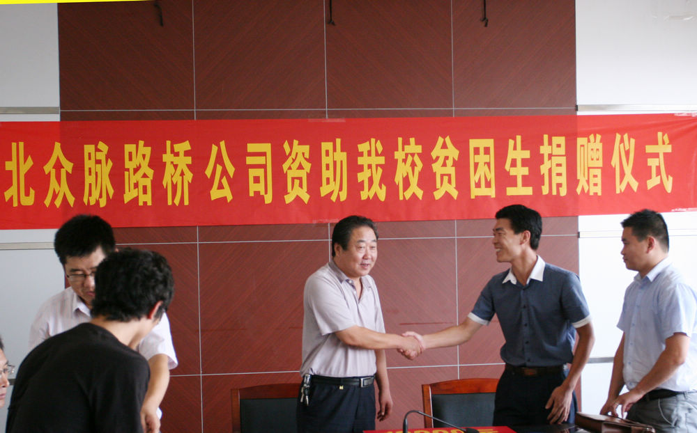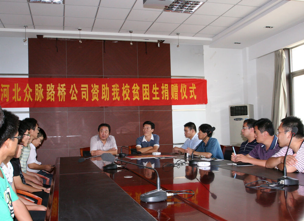 刘月廷校长表示,首先我代表学校对河北众脉路桥工程有限公司捐资助学的善举表示衷心感谢!捐资助学的关键不在捐资数量的多少,主要是倡导了一种中华民族扶危济困的民族精神,希望受助的同学们摆正心态,在大学里,认真学习,积极参与公益活动,用优异的成绩回报社会。(常树青 李智)