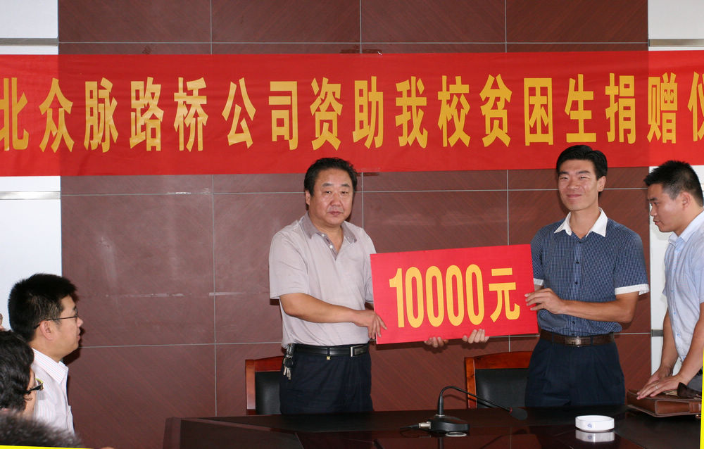 在仪式上,当河北众脉路桥工程有限公司领导亲手把助学金发放给5名学生代表时,深情而热烈的气氛感染了现场的每一个人。