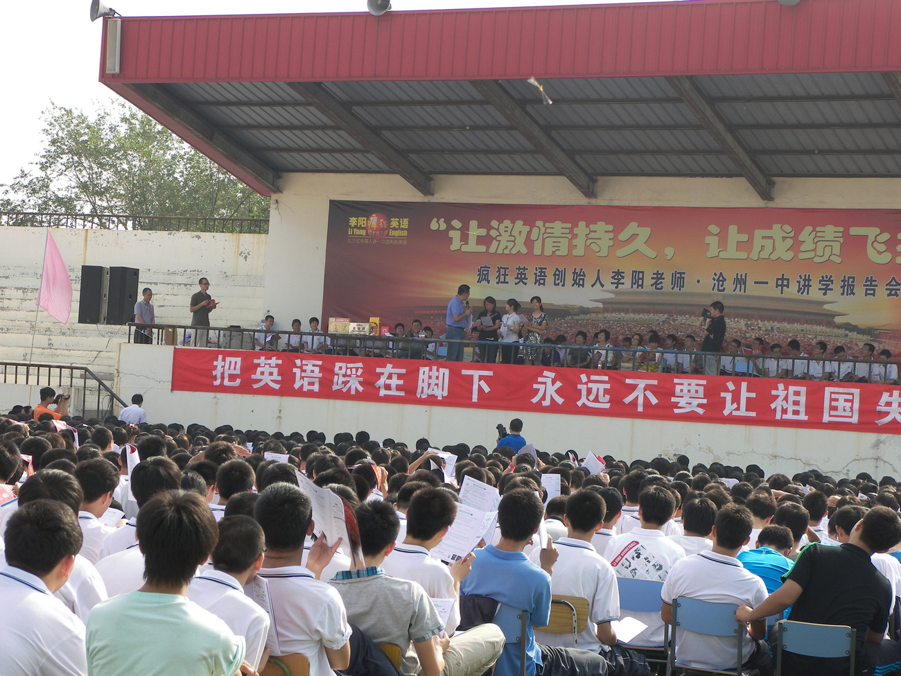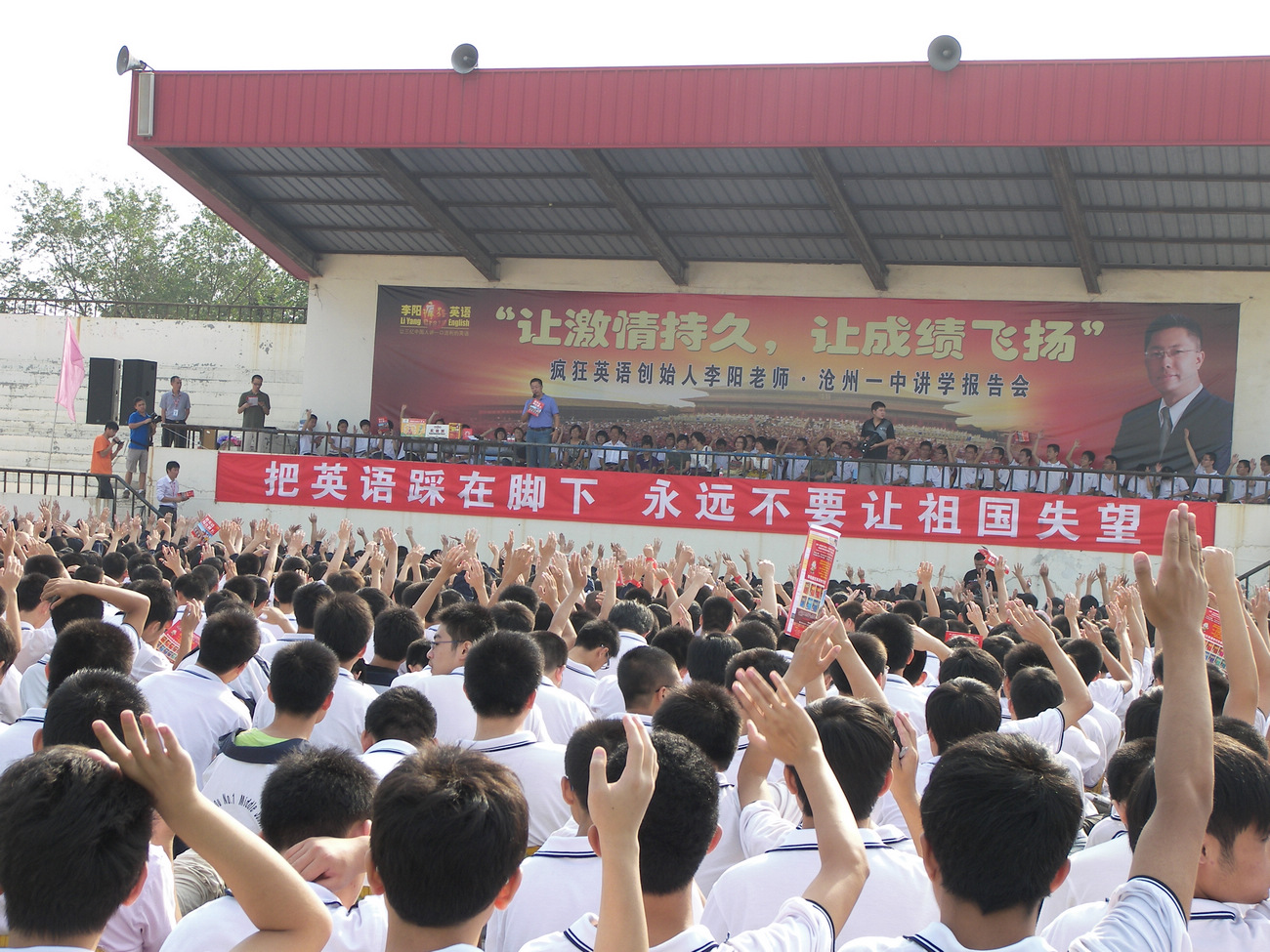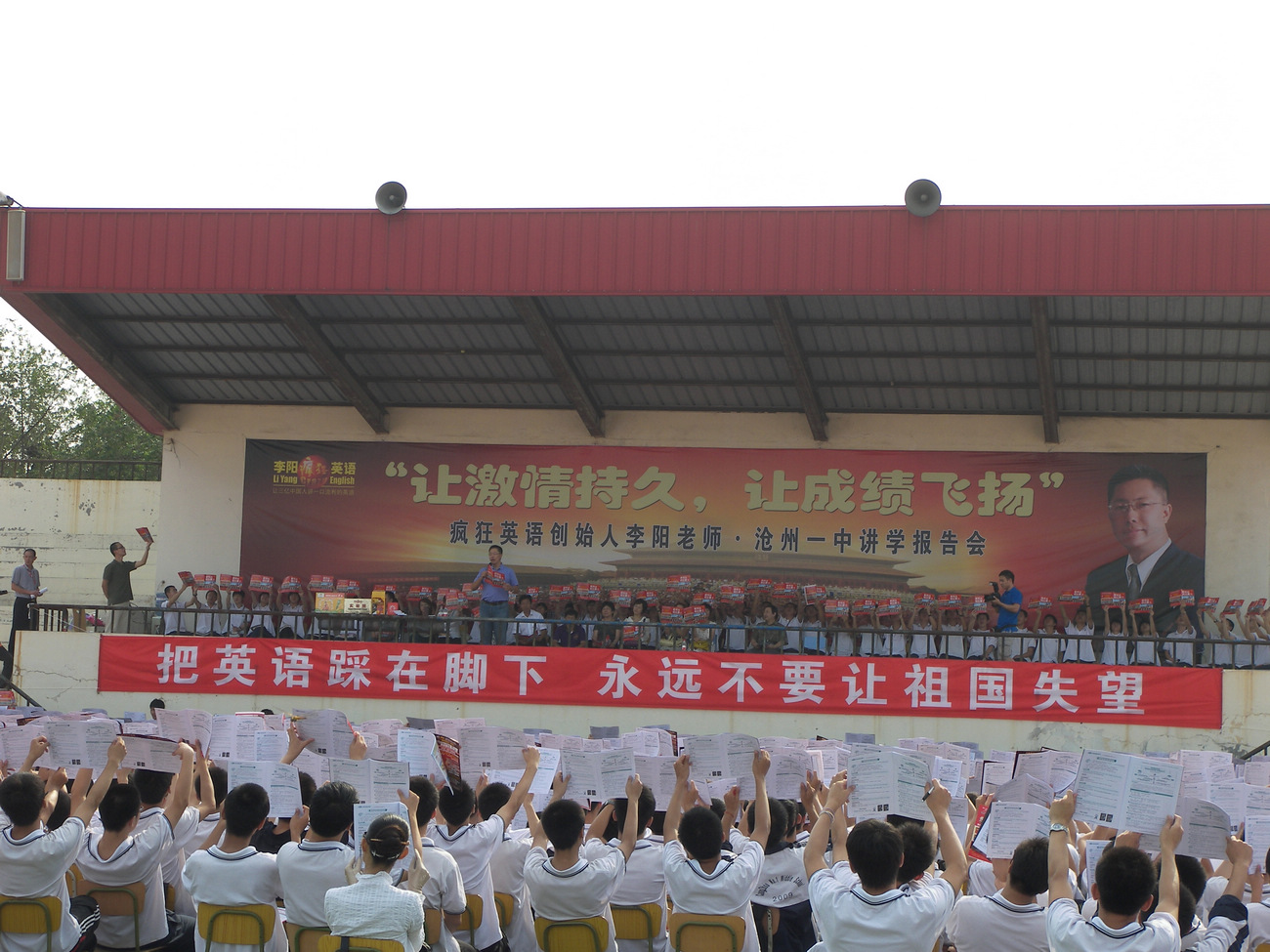 在三个小时的报告会中,同学们兴奋不已,情绪高涨,高举着会上分发的英语资料,配合李阳老师大声喊着英语,一起为英语疯狂。