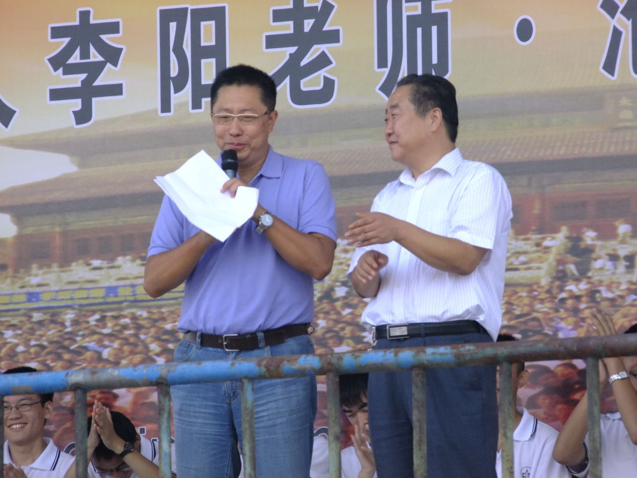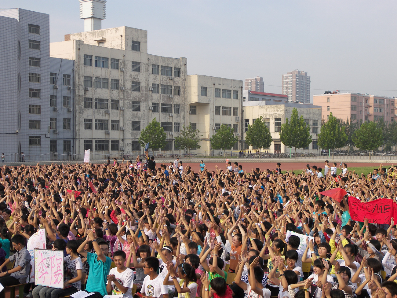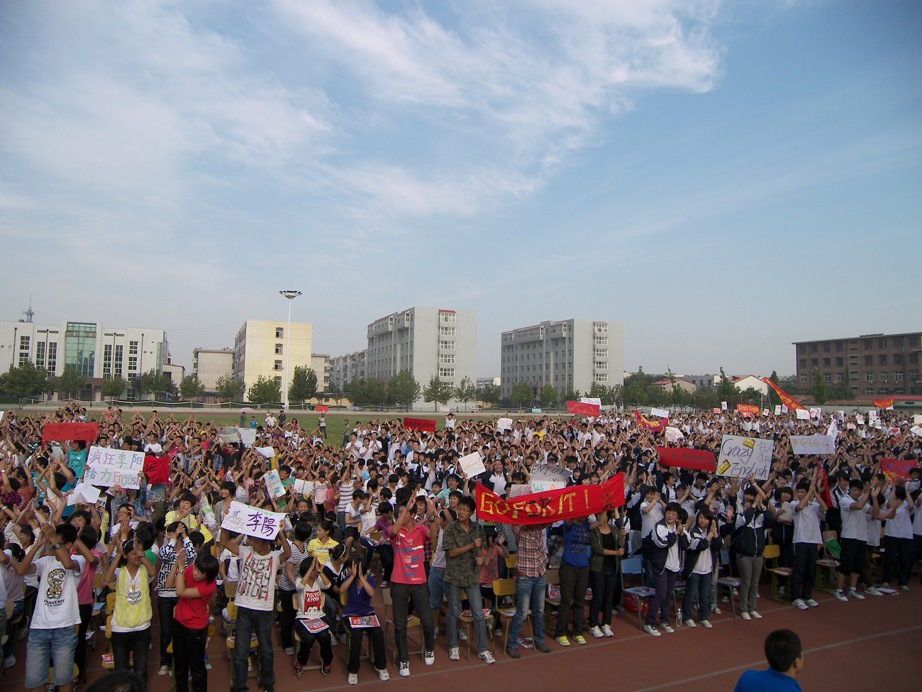 在三个小时的报告会中,同学们兴奋不已,情绪高涨,高举着会上分发的英语资料,配合李阳老师大声喊着英语,一起为英语疯狂。