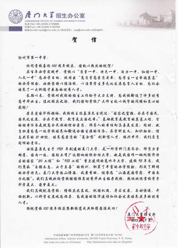 • 浙江大学向我校发来贺电2013-09-19 09:46