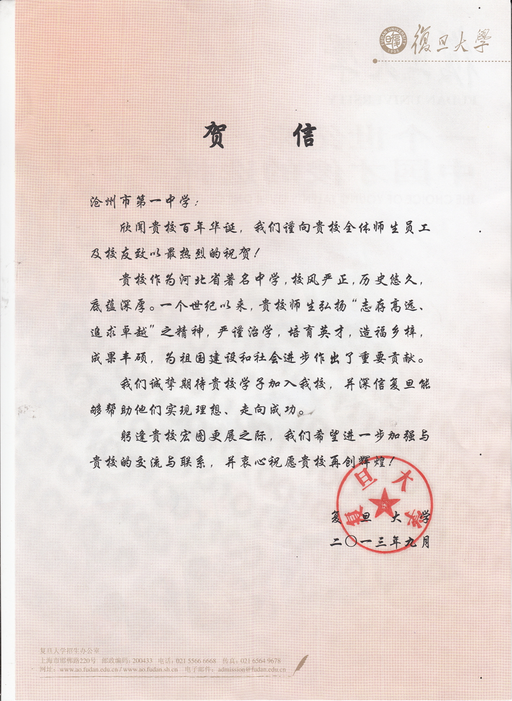 • 复旦大学向我校发来贺电2013-09-20 17:13