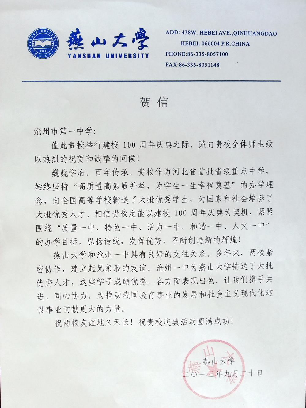 • 燕山大学为我校发来贺电2013-09-25 15:26