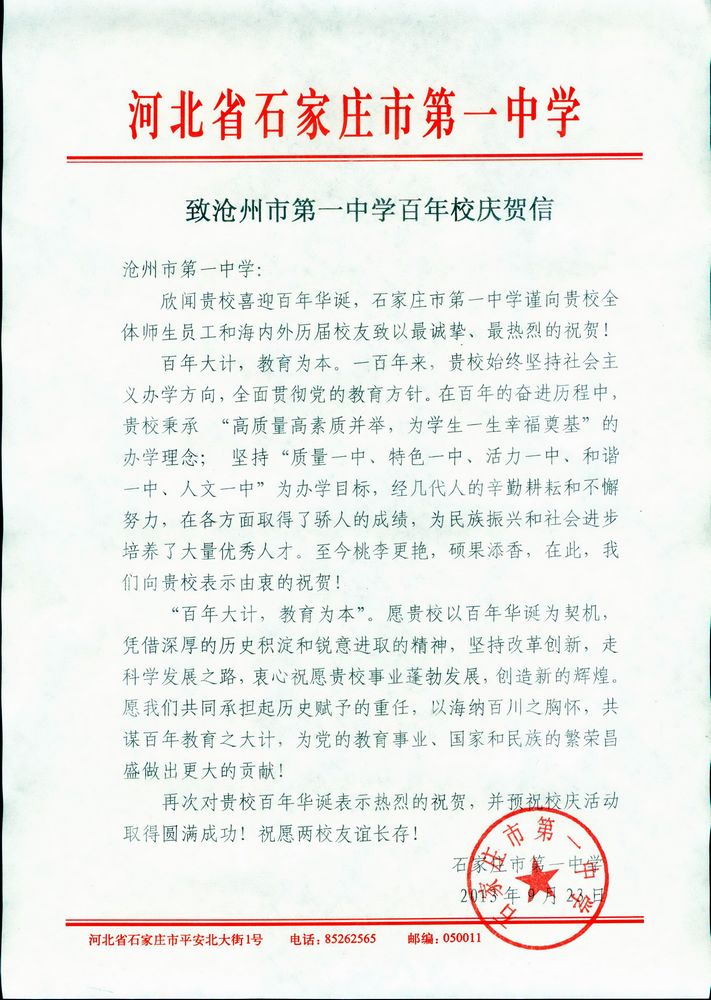 石家庄一中给我校发来的贺信