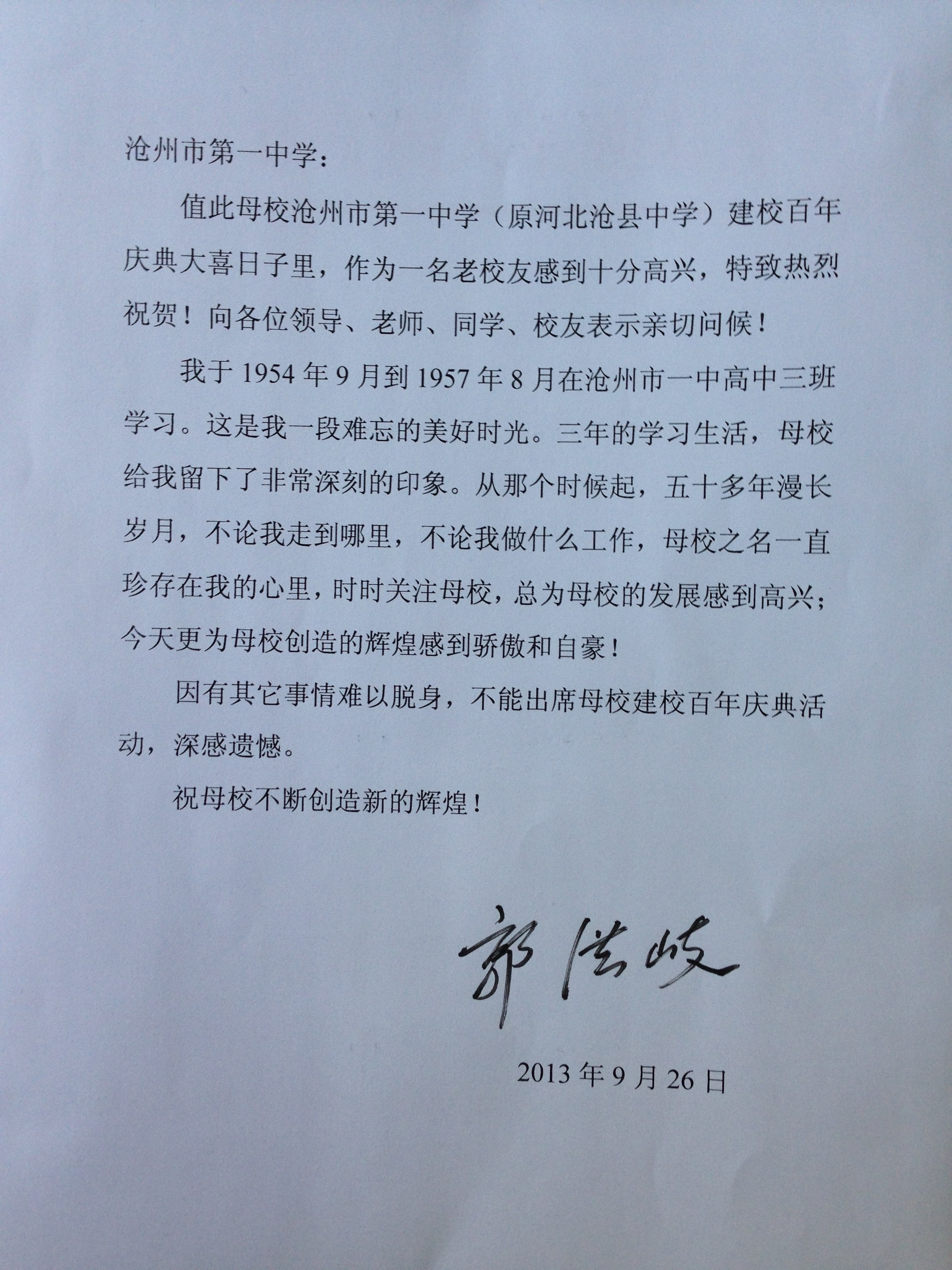 校友郭洪岐给母校发来的贺信