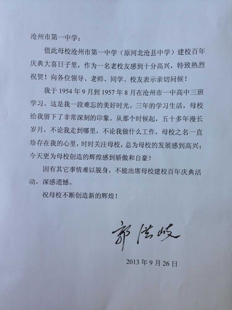 • 校友郭洪岐给母校发来的贺信2013-09-26 15:44