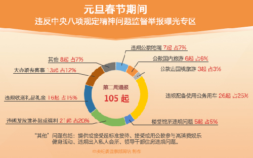 人民网北京1月16日电 中纪委网站自开通元旦春节期间违反中央八项规定精神问题监督举报曝光专区以来,以每周通报的形式公布各地查处违反中央八项规定精神问题的情况。今天,中纪委网站再次通报,各级纪检监察机关日前查处105起违反中央八项规定精神问题。从通报情况看,违规配备使用公务车、违规发放津补贴或福利等问题较为突出。