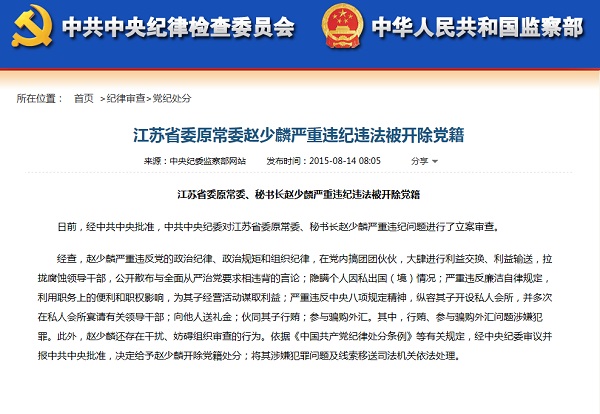 2015年8月14日,江苏省委原常委赵少麟因严重违纪违法被开除党籍。在中央纪委发布的纪律处分通报中,赵少麟被指严重违反党的政治纪律、政治规矩和组织纪律,在党内搞团团伙伙,大肆进行利益交换、利益输送,拉拢腐蚀领导干部,公开散布与全面从严治党要求相违背的言论。