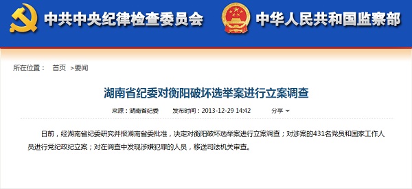 2012年底至2013年初,衡阳市在召开人大会议选举省人大代表过程中,76名省人大代表有56名存在送钱拉票行为,出席会议的527名市人大代表有518名收受钱物,有76名大会随团工作人员收受钱物,涉案金额达1.11亿余元。2013年12月29日,湖南省纪委对衡阳破坏选举案进行立案调查。