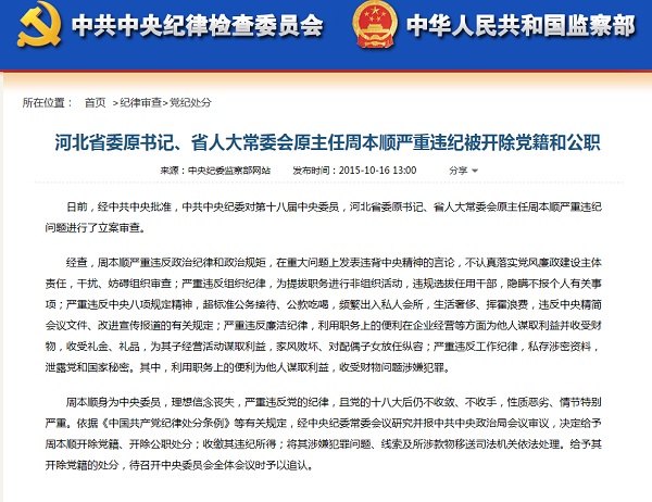 2015年10月16日,河北省委原书记、省人大常委会原主任周本顺严重违纪被开除党籍和公职。在中央纪委发布的纪律处分通报中,周本顺被指严重违反政治纪律和政治规矩,在重大问题上发表违背中央精神的言论。