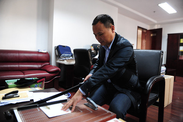 图为浙江省纪委信访室工作人员吕新民用切纸机打开信封