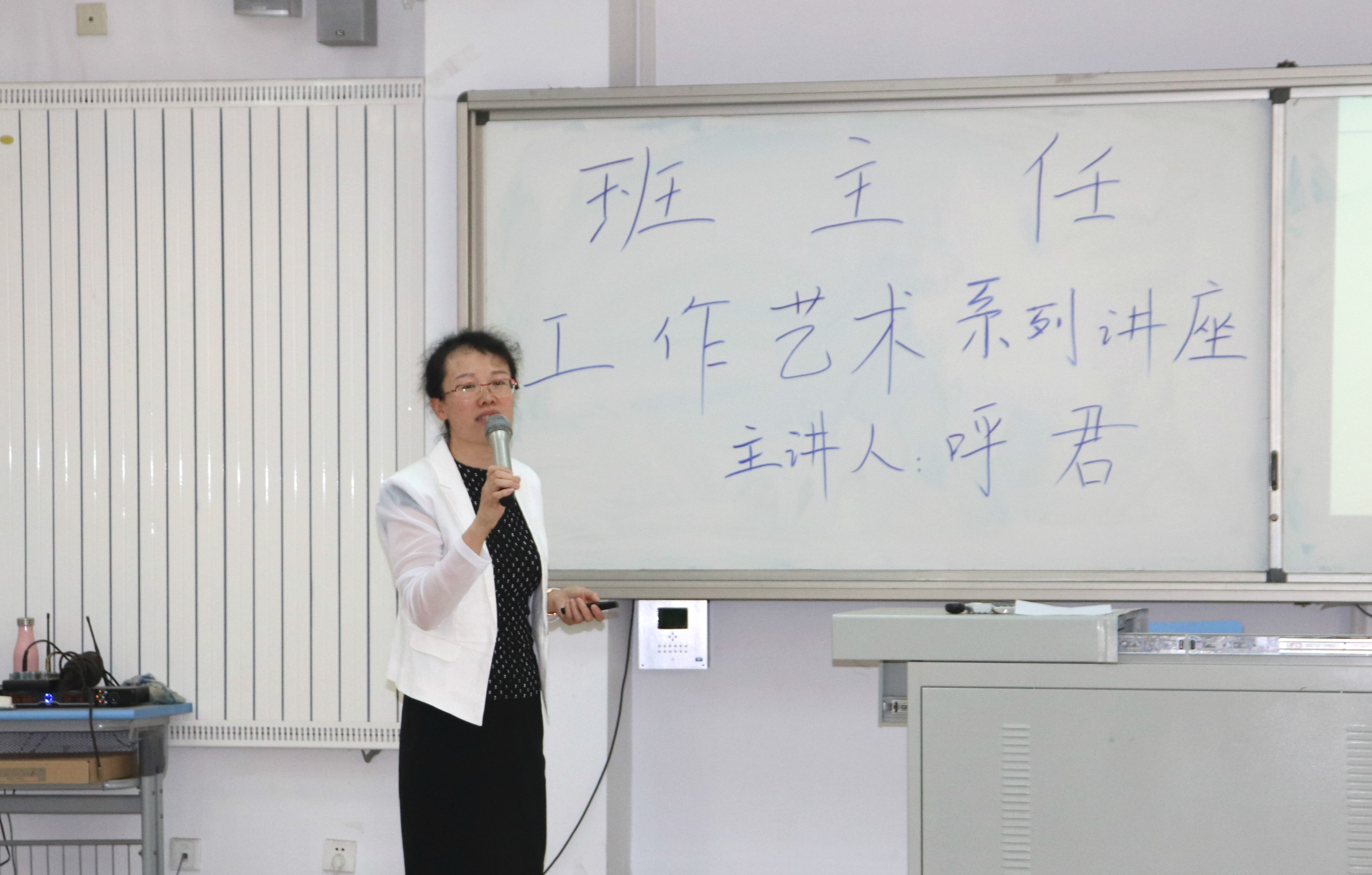 5月24日下午,我校班主任工作的艺术性研讨系列活动如期举行,第一期邀请到了我校特级教师、河北省名师工作室负责人呼君老师,为班主任老师与年轻教师们做了一场精彩并实用的"班主任的工作艺术”讲座:《班主任工作"四"加“一”》。
