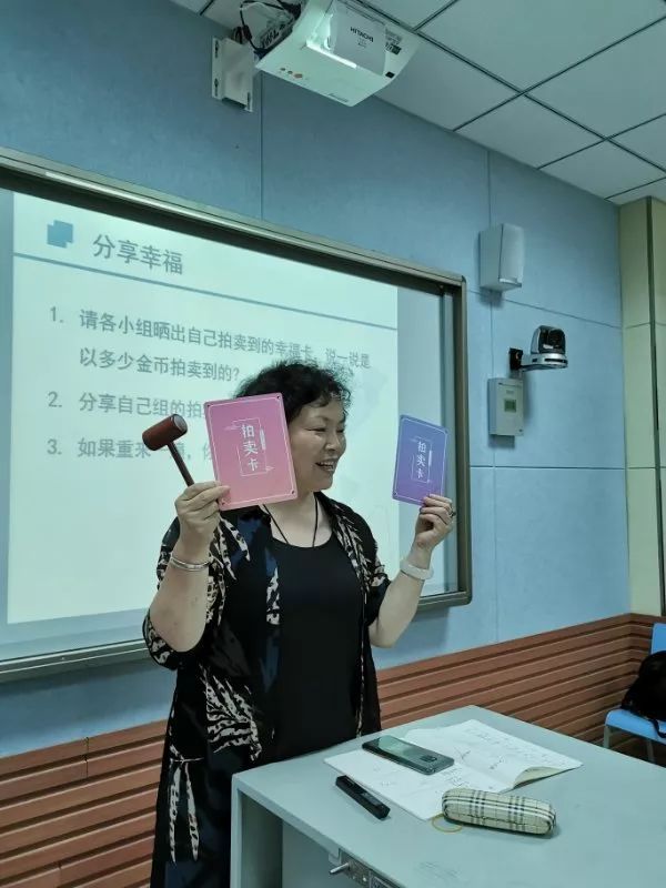 燃情岁月模块里,最振奋人心的是:经济大繁荣时期的拍卖环节,拍品有豪宅、健康的身体、二三知己、一次环游世界的机会、一份高额商业保险、一座图书馆、陪伴家人的时光等等。大家竞相叫价,未买到自己心仪的拍品的小组,扼腕叹息,而抢拍到的小组得意地笑开花,大家兴致勃勃地分享拍卖过程的感受。凤阳老师小组很满意自己拍到了与家人陪伴的时光和一座豪宅,他们说,让家人生活幸福正是自己毕生奋斗的目标。爱读书的庆林老师非常渴望拍上一个图书馆,但苦于手中资金不足,没有拍得,难过与不舍溢于言表。吴冰鹤老师说,虽然我们没有拍得心仪的幸福卡,但是看到大家这么开心,我们觉得“失也是一种得”。