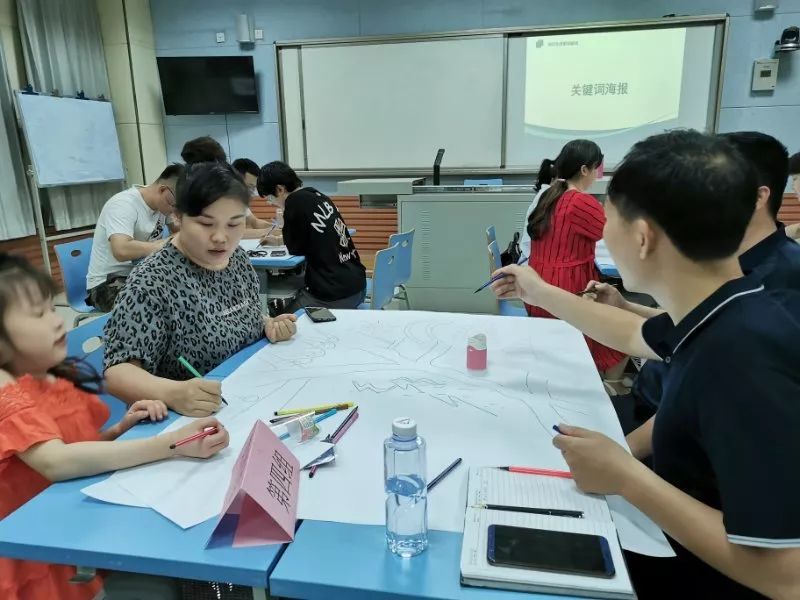 游戏开始了,首先,每个组抽取了一张关键词卡,然后就关键词卡内容各组思考讨论并做了海报展示,胡春雨老师小组抽到的关键词“支持系统”,她在海报上画了自己的27班。她说:做为27班的班主任,支撑自己班级的有学校各个科室,有各位任课老师,有自己的家人,有所有的学生,家长等等,都是她职业生涯的支持力量。刘璐老师小组抽到的关键词是“人生阶段”,他们形象地画了四个瓶子,第一个是奶瓶代表被人照顾的幼年,第二个是青岛啤酒瓶,代表激情四射的青年,第三个瓶子是个保温杯,热水加枸杞,代表需养生的中年,而第四个是一个吊着的输液瓶子,代表身体退化的老年。就这样,每个组分别在海报上,用绘画的形式诠释了自己组的关键词,组员们迅速融合为一个整体,展示过程又各自被其他组的才华折服。
