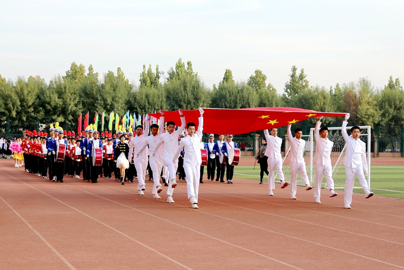 本届运动会的主题是“顽强拼搏,突破梦想”。运动场上人声鼎沸,彩旗招展,展现我校全体师生创先争优,奋力拼搏,走向复兴的冲天豪情。踏着青春的节拍,奏响铿锵的乐章。伴随着激情昂扬的解说,国旗护卫队首先登场。他们踏着整齐有力的步伐向主席台走来,他们气宇轩昂精神抖擞,象征着我校开拓创新勇往直前的精神风貌,他们矫健的身姿飒爽的风采,伴随着庄严的国旗,昭示青年人将永远走在时代的最前列。鲜花绽放,激情飞扬。花束队方阵踏着整齐的步伐向主席台走来。紧随其后的是彩旗队“彩旗飘扬,突破梦想”他们以良好的精神面貌向我们展示了顽强拼搏、超越自我的风采。