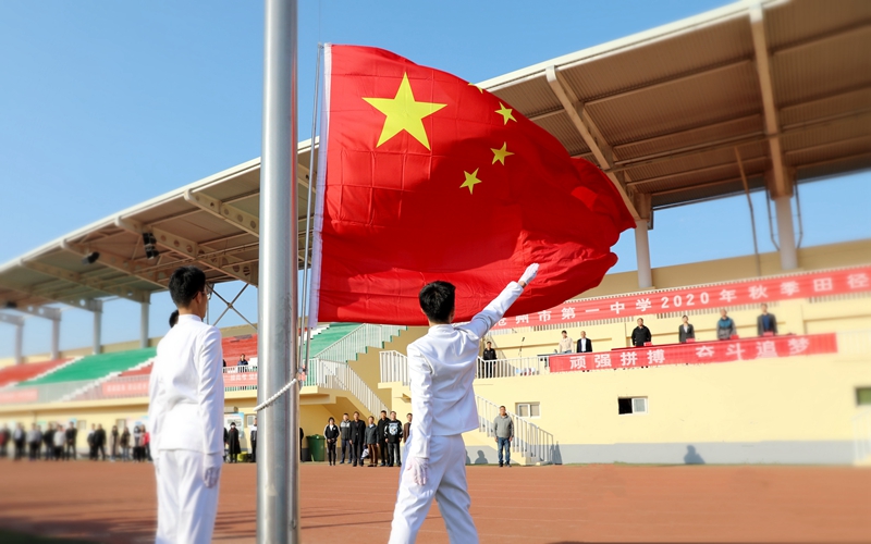 入场式结束后举行了庄严的升国旗仪式。五星红旗在朝阳中冉冉升起,雄壮的国歌声响彻一中天空。