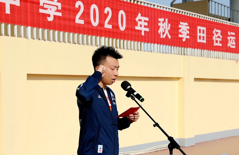 体育老师徐洋代表全体裁判员宣誓。全体裁判员坚决服从裁判长的指挥,严格遵守裁判员纪律,尊重参赛选手,严肃认真,公正裁判,确保本届运动会圆满成功。