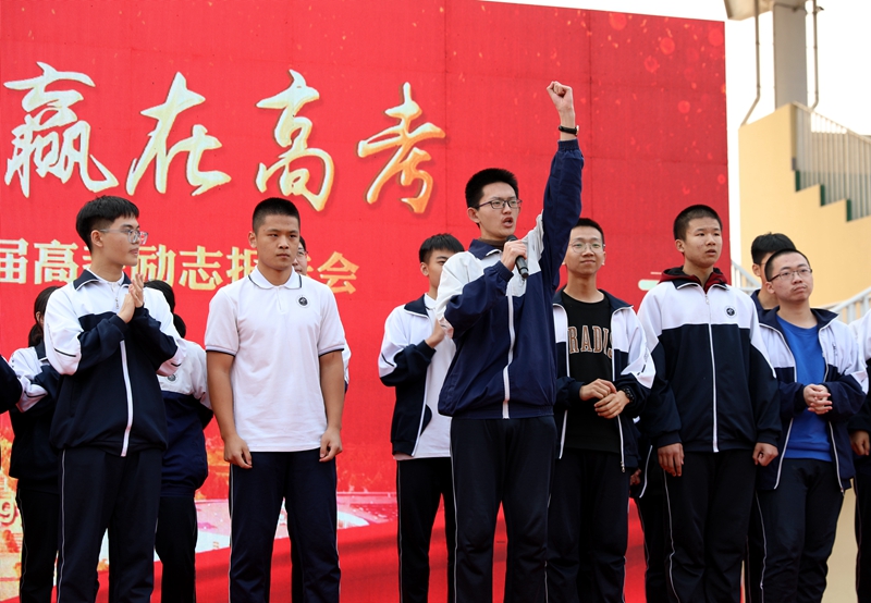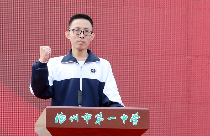 高三24班杜佩涵同学代表全体高三学生做了表态发言。他说,我们既然选择了高山,就要征服顶峰;既然选择了高考,就要一战辉煌。面对高考这场没有硝烟的战争,同学们已经整装待发,时刻准备着勇敢地冲上去,为自己拼出一个美丽的人生!