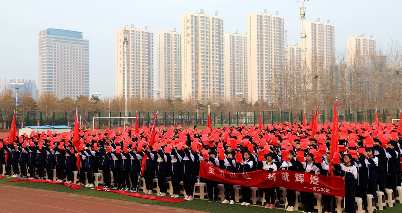 战旗猎猎,锣鼓喧天。2点30分,高三年级师生排着整齐的队伍,意气风发地走入会场。嘹亮的口号声,顿时响彻美丽的校园。